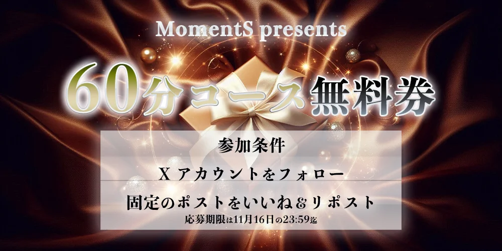 - 『MomentS』の極上リラックスをぜひご体感ください!オープニングキャンペーンとして、人気の100分コース(通常14,000円)を12,000円の特別価格でご案内いたします。この機会をお見逃しなく!